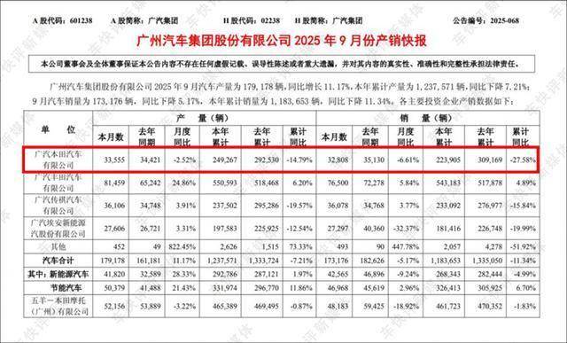 根据广汽集团公布的9月产销快报数据显示,广汽本田无论是今年9月还是今年1~9月,销量相比去年同期都是呈下降趋势的。特别是今年前9个月,广汽本田累计销量还不到31万辆,同比下降27.8%。