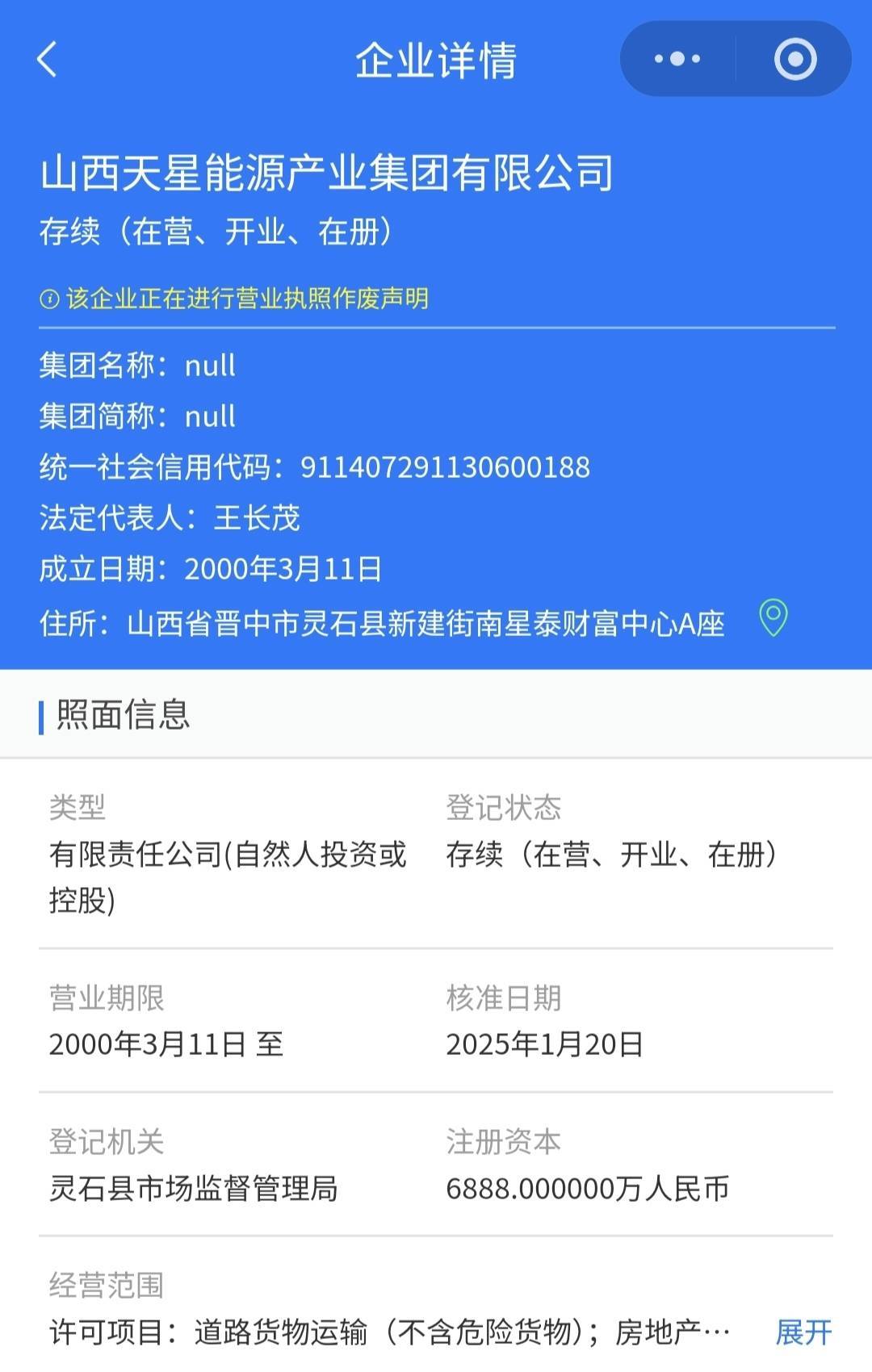 记者20日通过天眼查查询发现,山西天星能源产业集团有限公司(简称“天星集团”)注册资本金6888万元。据晋中市工商业联合会2024年发文介绍,天星集团进入2024山西省民营企业100强榜单,列第58位。2025年9月18日,山西省工商联发布2025山西省民营企业100强榜单,该集团继续上榜。