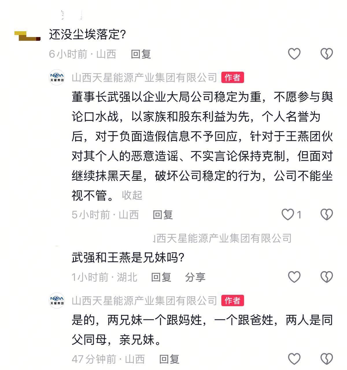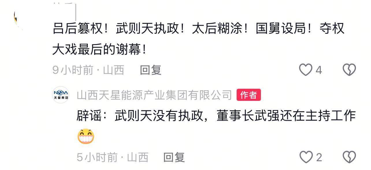 然而,3月20日,另一个同样名为“山西天星能源产业集团有限公司”的抖音账号发布了“董事长变更为王燕不属实”的视频。该视频称,王燕当选为天星集团公司董事会董事长的文件,有多处不符合公司现行文件格式,“文件一眼假,是她自己打印自己盖章的”。该视频称,正式使用20多年的公章在公司,并未丢失或失控,而王燕谎报丢章后刻的新章在她自己手里,两章编码不同。视频中还说,发布上述文件的社媒账号没有企业认证,系已被免职的员工杨某的个人账号。20日,该账号在评论区回复网友评论称,董事长武强以企业大局公司稳定为重,不愿参与舆论口水战,以家族和股东利益为先,个人名誉为后,对负面造假信息不予回应,针对王燕团伙对其个人的恶意造谣、不实言论保持克制,但面对继续抹黑天星、破坏公司稳定的行为,不能坐视不管,并称:请大家认准我们官方抖音号,我们是企业官方认证号,以此信息为准。该账号称,武强是王长青的儿子,王燕为王长青的女儿,两人是同父同母亲兄妹。有网友评论称“吕后篡权,武则天执政,太后糊涂,国舅设局,夺权大戏最后谢幕”,该账号回复:“辟谣,武则天没有执政,董事长武强还在主持工作。”记者注意到,该抖音账号得到平台蓝V认证,并公布了营业执照。
